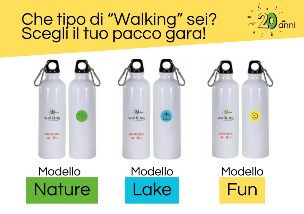 Per l’edizione 2026, in occasione dei 20 di Raiffeisen Walking Lugano, avrete la possibilità di scegliere il vostro regalo. Abbiamo preparato tre modelli di borraccia (nature, lake e fun).